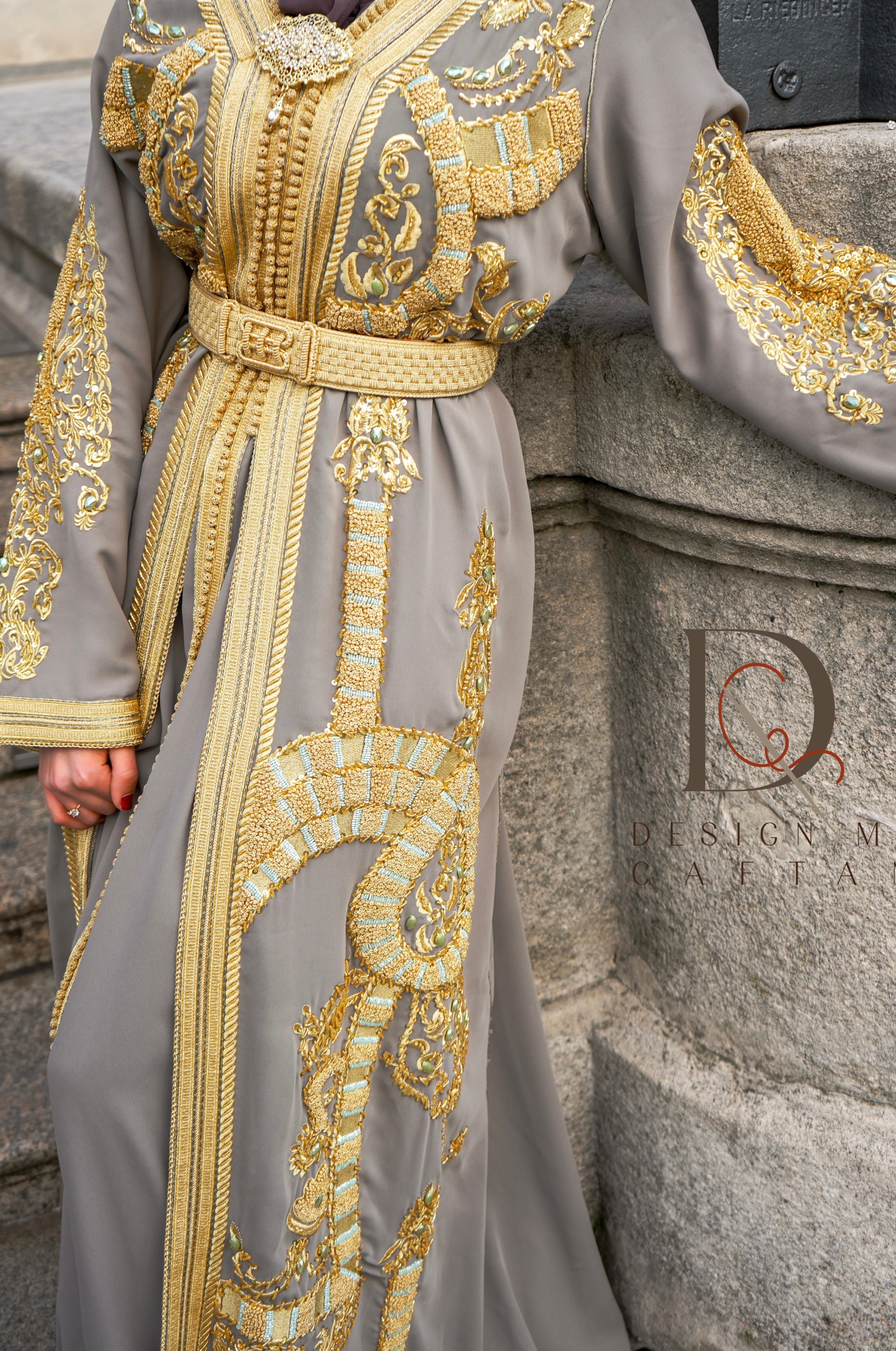 Eine stilvolle und luxuriöse Interpretation marokkanischer Mode, die edle Stoffe, glänzende Akzente und moderne Schnitte miteinander verbindet und ist im Neuzustand