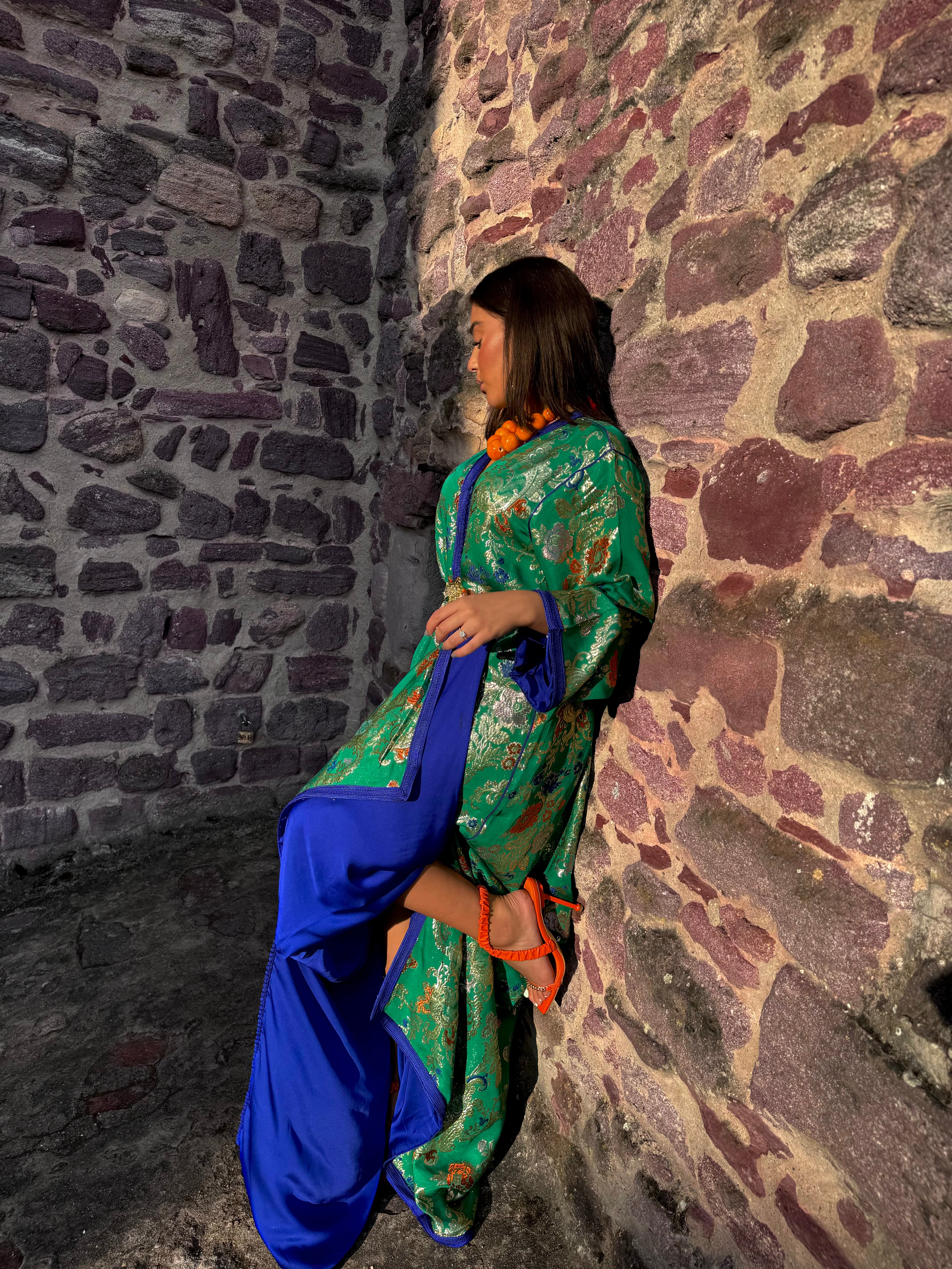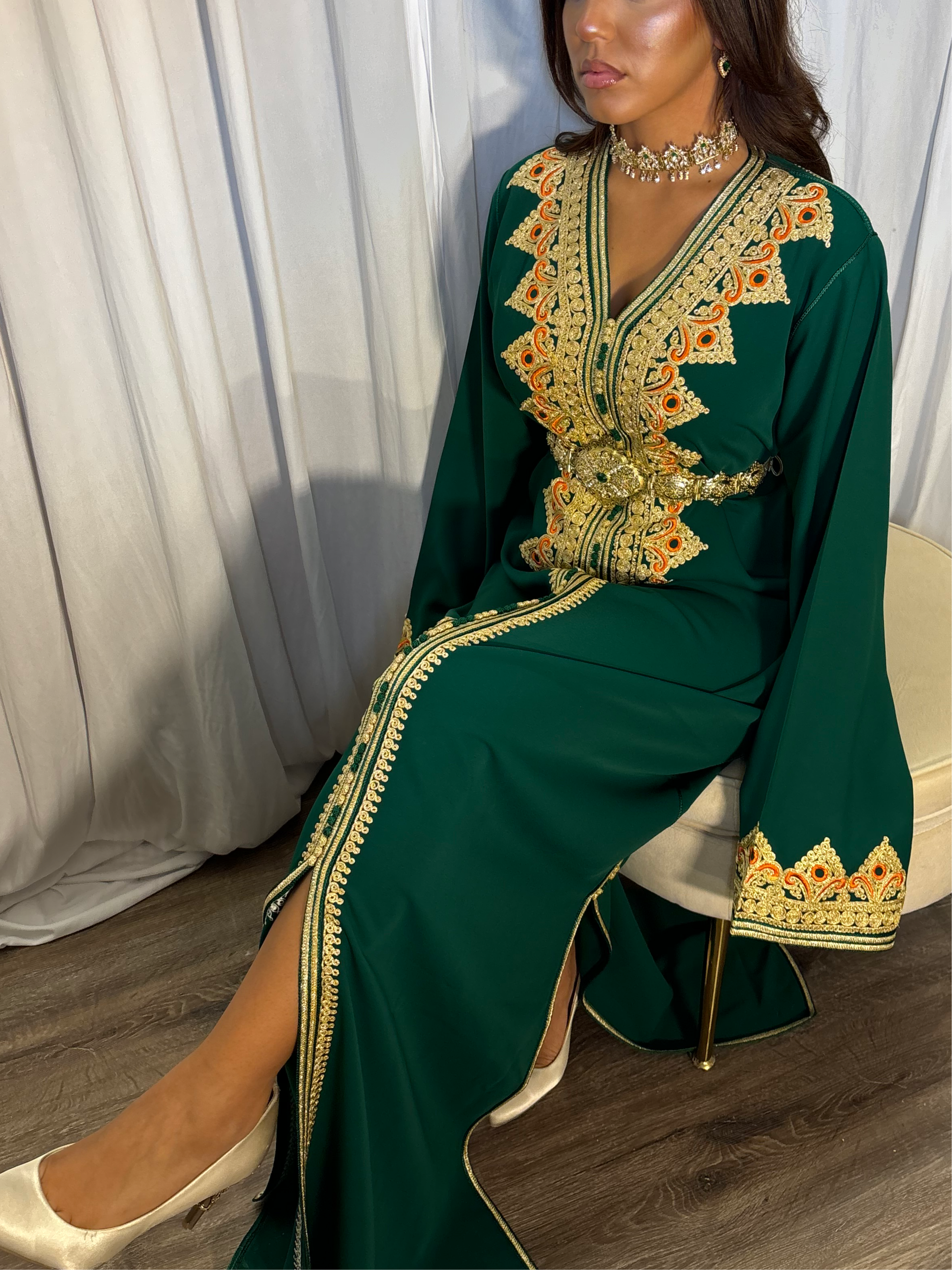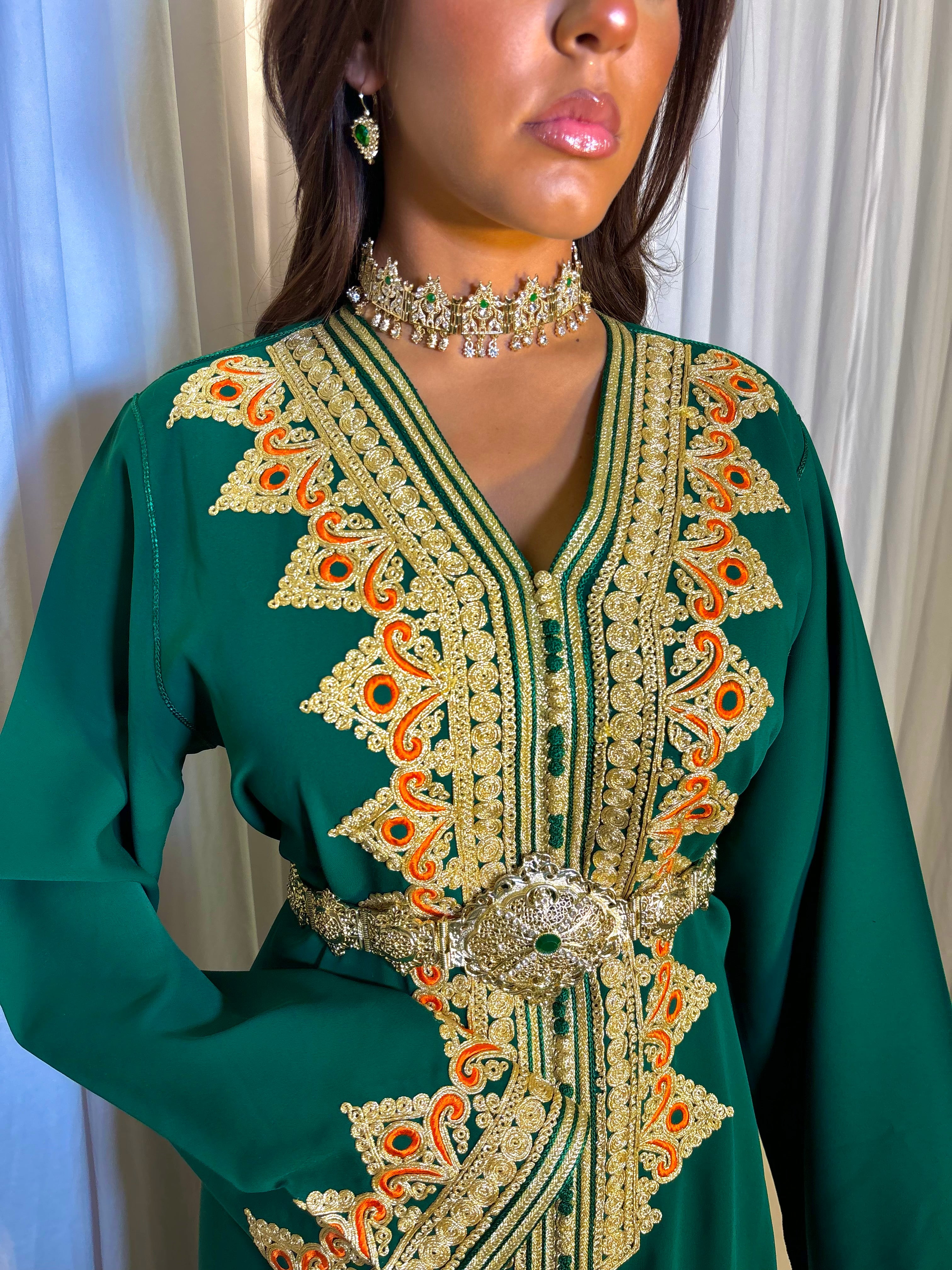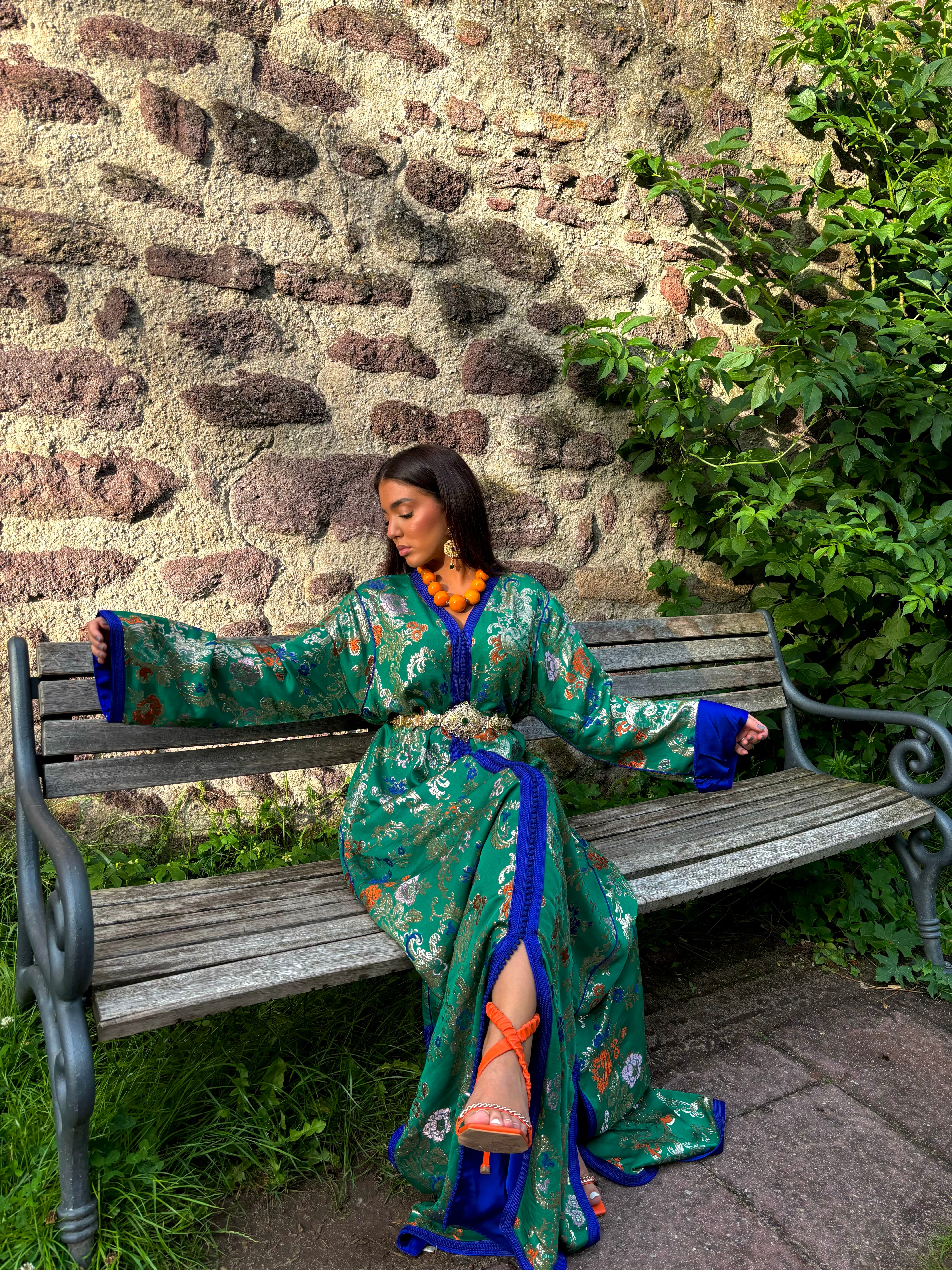 Dieser grüne Kaftan mit orangen und goldenen Akzenten ist ein wahres Highlight. Die zeitlosen Farben und die feinen Details machen ihn zu einem eleganten Begleiter für besondere Momente